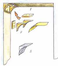 Pena vystrihnuté z troch častí a držať spolu medzi sebou v držiaku (gleje rovnaké). Po zaschnutí podľa zaťaženia (podľa pokynu k lepidlo) zátvorkách sú lepené na rohy clony a sušenie shpakljujut.